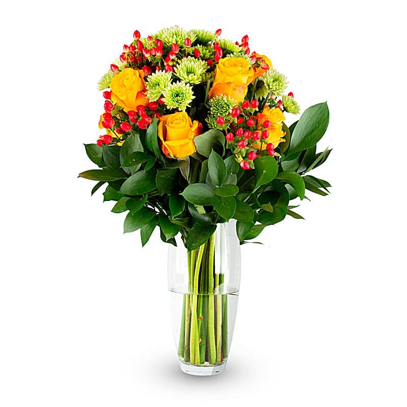 Tropico donosi eksploziju boja i egzotičnu energiju tropskih predjela. Vatreno crvene anturijume, žarke narandžaste cvjetove i duboko zelene listove prati živahni duh ljeta i avanture.
